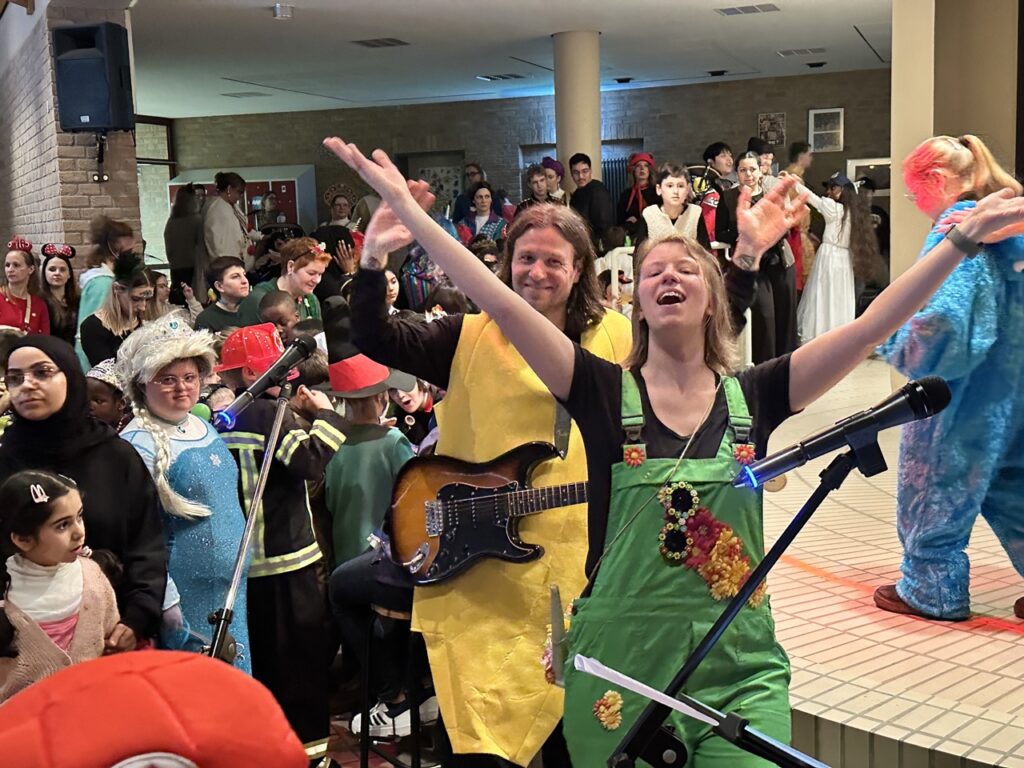 Fettdonnerstag in der Kleebach-Schule heißt immer viel Spaß und eine große Feier. Mit dem hohen Besuch vom Brander Prinz mit seinem Gefolge und vielen tollen Beiträgen von SchülerInnen und KollegInnen. Viele kommen mit lustigen und bunten Kostümen in die Schule. Unsere Band sorgt für gute Stimmung und zwischendurch gibt es eine leckere Hot-Dog-Pause.